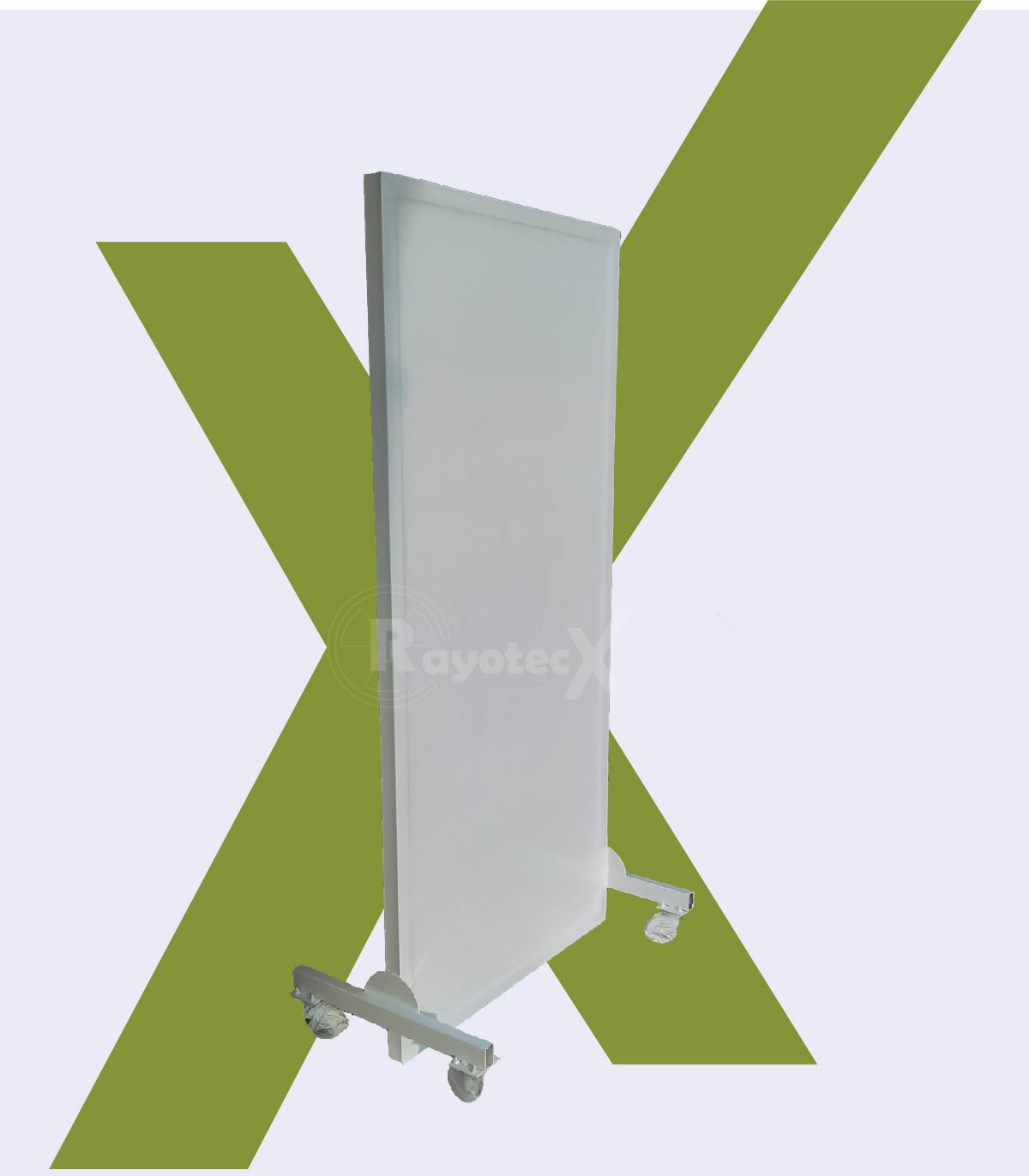 Biombo plomado, blindado en lamina de plomo de 1 mm. Elaborado con estructura metálica, cubierto en melaminico o triplex pintado. Con sistema rodante en llanta siliconada para evitar rayado de pisos.